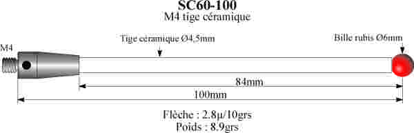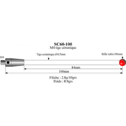 Palpeur corps inox filetage M4, tige céramique Ø4.5 x 84mm, bille rubis Ø6mm grade 06,